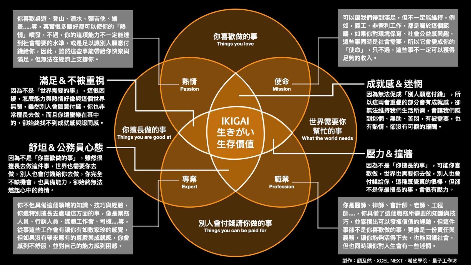 如果不喜歡,可以試試「ikigai」,ikigai (生きがい) 就是「The reason for living」也就是「生存的理由」,它所揭示的四個面向非常實用,每個人都可以隨時拿來自我檢視。